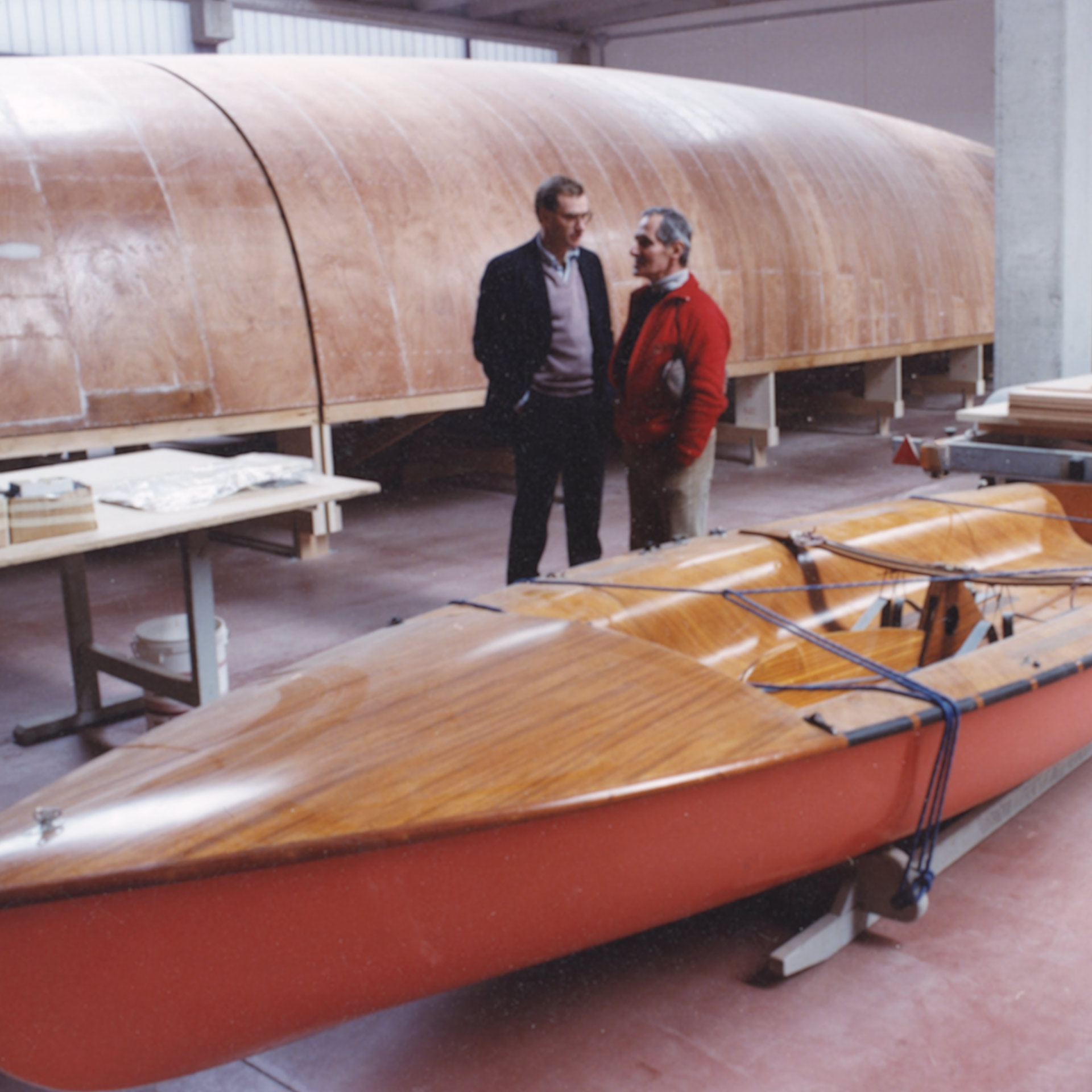 Alla fine del 1957 si traferisce sul Lago di Garda, che rimarrà la sua “casa d’acqua e di vento” per tutta la vita. Con i primi anni ’60 inizia il suo percorso di progettista e costruttore che darà vita al suo primo scafo: STRALE, una deriva veloce e competitiva, che porta con sé elementi di innovazione, sia sotto il profilo progettuale che costruttivo.